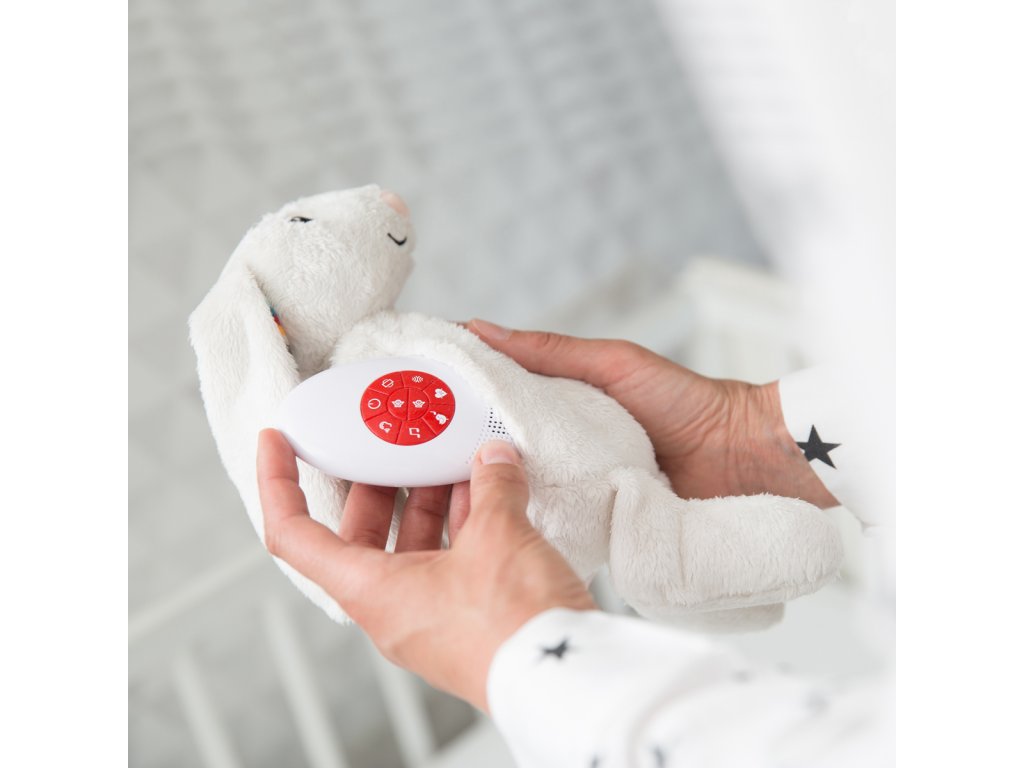 V bříšku zvířátka se skrývá zvukový modul, na kterém si můžete vybrat 3 tradiční ukolébavky a 3 zvuky.