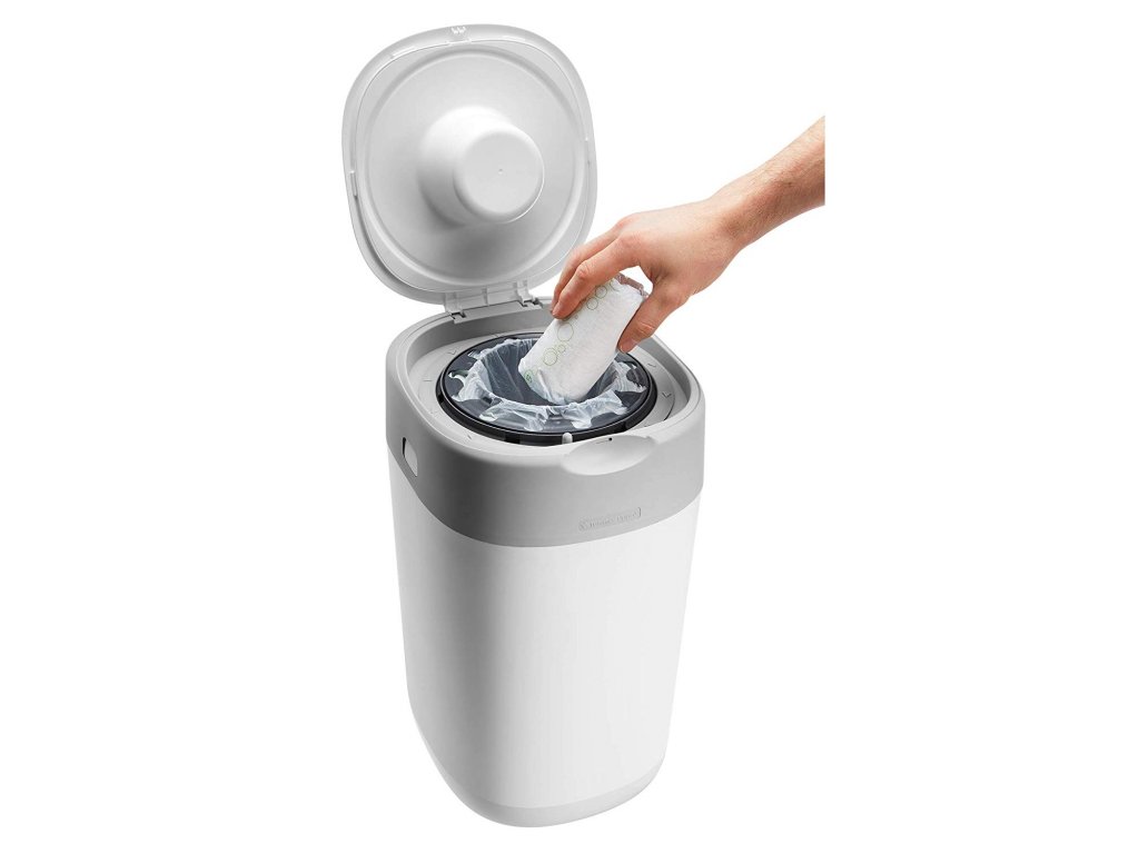 Víko koše je vybaveno pístem, který zatlačí použitou plenku do zásobníku.