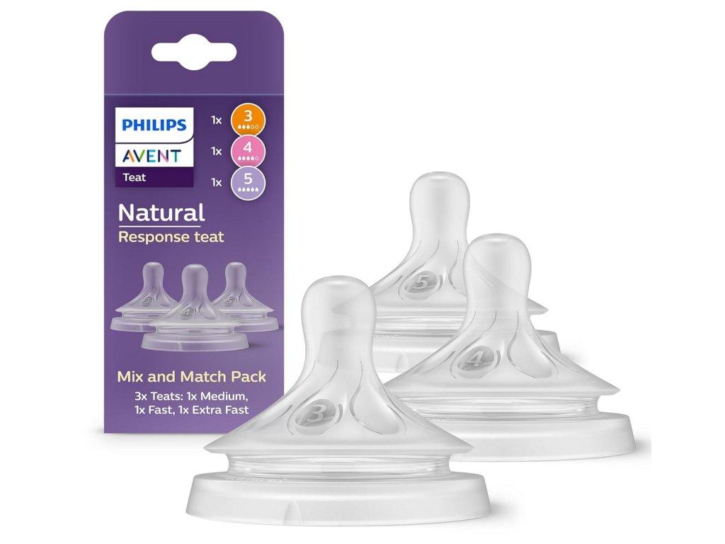 Avent sada 3ks saviček Natural Response - 1x střední průtok č. 3, 1x rychlý průtok č. 4, 1x velmi rychlý průtok č. 5. Vhodné pro kojenecké lahve Avent Natural a Natural Response.