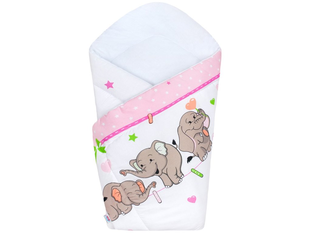 Dětská zavinovačka New Baby s obrázky slonů a zapínáním na suchý zip je praktickým pomocníkem na rychlé zabalení miminka, které je tak v teple a neodkope se.